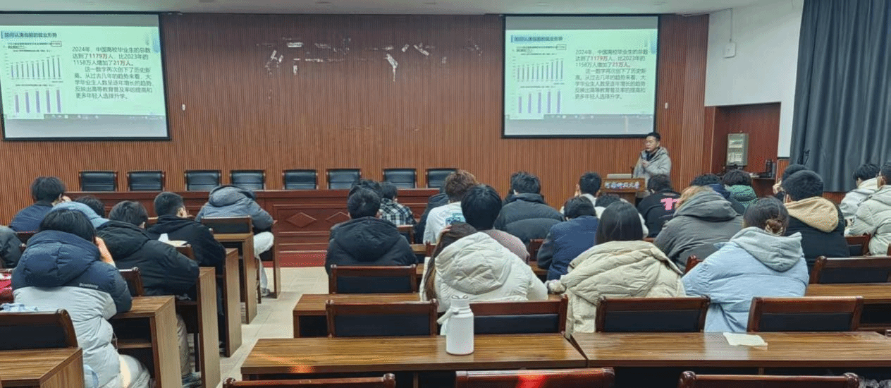 讲座伊始,张风光结合自己的创业经历,讲述了洛阳市鼎航人才服务有限公司的产品及服务领域,组织经营管理模式以及公司未来愿景。随后,张风光围绕当前就业形势、就业规划与青年人才政策展开分享。他指出,企业招聘时,实习经历、专业与岗位匹配度是核心考量因素;大学生需通过社会、家庭与学校协同引导,做好职业规划应对。他同时强调,大学生应结合自身专业与发展需求,制定科学学习规划,夯实专业基础、提升综合素养,主动参与社会实践,以磨砺意志、锤炼本领、养成良好习惯。此外,他还介绍了青年人才政策,涵盖不同学历群体补贴、青年住房保障及小微企业创业资金扶持等内容。最后,张风光与现场同学展开深度互动交流,针对同学们提出的相关疑问,进行了细致耐心的解答,现场交流氛围热烈融洽。