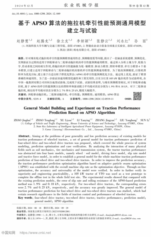 18 基于APSO算法的拖拉机牵引性能预测通用模型建立与试验-农 业机械学报